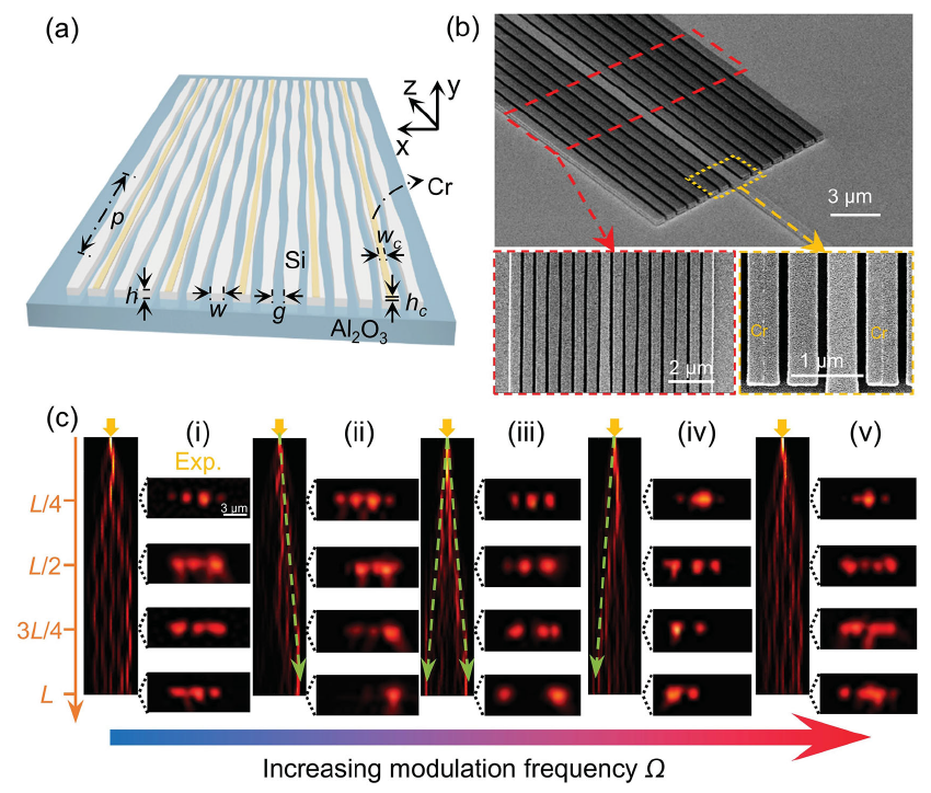 为了进一步实验验证上述的多种拓扑相,研究人员设计了多组不同调制周期[(i) p = ∞ (无调制), (ii) p = 43, (iii) p = 21, (iv) p = 15, and (v) p = 8 μm]、宽度沿传播方向变化的硅波导阵列,通过在波导上覆盖Cr条而引入损耗,如图3(a,b)所示。为了得到演化趋势,研究人员专门设计了多组不同长度的波导。在实验中,通过将1550 nm波长的激光耦合输入到阵列中间波导,得到输出端的光强信号。可以看到,对于(i)没有调制和(v)高频调制,最终的输出光场是弥散的,而在(ii) p =43μm, (iii) p = 21μm, (iv) p = 15μm的结果分别是局域在左端、两端和局域在右端,与仿真的光演化趋势基本一致,如图3(c)所示。