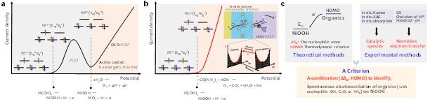 图1. 理解水氧化和尿素氧化机理性挑战。(a)碱性电解液中Ni(OH)2电极水电氧化反应的典型阳极极化曲线。(b)Ni(OH)2电极尿素电氧化反应的典型阳极极化曲线。(c)电荷转移机制研究所采用的理论和实验方法。