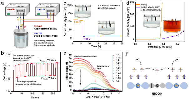 图4. 三价镍直接电荷转移动力学。(a)双化学工作站监测电极反应动力学。(b)当阳极电位在1.45 V和1.4 V之间阶跃时,电池反应动力学。(c)含有丁二酮肟钠盐的电解液中的恒电压反应及实时电解液光学照片。(d)含有丁二酮肟钠盐的电解液中CV循环扫模拟电子转移经由Ni(OH)2/NiOOH氧化-还原过程的电解液光学照片。(e)阻抗谱监测催化层/体相和催化层/电解液界面电子转移动力学。(f)通过Ni3+ (t2g6eg1)未占据的eg轨道进行直接电子转移示意图。