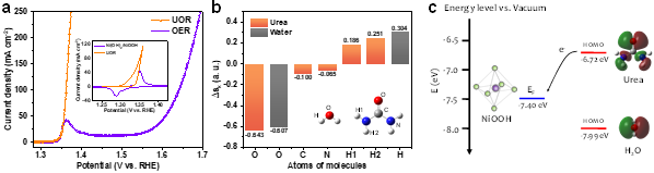 图2. 水氧化和尿素氧化的本质差异。(a)尿素氧化(UOR)和水氧化(OER)极化曲线对比。(b)以尿素和水分子中每个原子的∆sk识别亲核原子。(c)尿素和水的HOMO能级和NiOOH的费米能级对比。