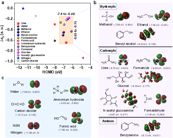 图5. 三价镍电氧化有机物的通用性。(a)以亲核原子∆sk和小分子的HOMO能级作为描述符,筛选Ni3+有效氧化的有机物。(b)可被Ni3+氧化的有机物的HOMO能级和结构式。(c)不可被Ni3+氧化的有机物的HOMO能级和结构式。