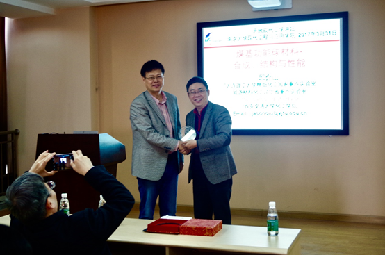 讲座由公司刘建国教授主持。讲座伊始,公司执行经理陆延青教授代表讲坛组委会向邱介山教授赠送了讲坛纪念品。在公司师生热烈掌声中,邱介山教授开始今天的讲座。在正式进入煤基碳材料相关的专业领域之前,邱介山教授首先明确了科研工作者的责任和目标:胸怀祖国,放眼世界,并注重科学创新、技术跨越、支撑经济、引领未来。随后,邱教授以几组生动形象的图片切入煤基功能碳材料这一主题。邱教授以自身经历讲起,向我们讲述了发展功能碳材料的驱动力以及煤基功能碳材料的科学基础。邱教授以其课题组的实验数据为基础,向我们详尽介绍了纳米碳管、碳量子点以及二维石墨烯等煤基碳材料的合成以及结构调控。在讲述将这些碳材料工业化的时候,邱教授强调了与他人交流合作的重要性。紧接着,邱教授详细介绍近几年成为研究热点的二维石墨烯这种新型碳材料的功能化方法及应用,如应用在油水分离、超级电容器、生物模板、锂硫电池等领域。