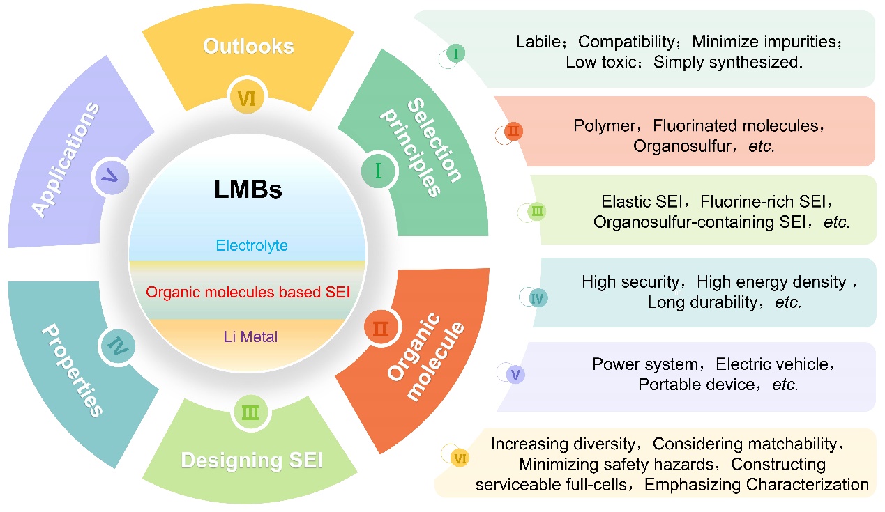 锂金属电池(LMBs)展现出了超过400 Wh kg−1高能量密度的发展潜力,因此被优先考虑作为下一代储能设备。然而,不可控的枝晶生长、难以捉摸的界面化学和不稳定的固体电解质界面(SEI)极大地威胁了LMBs的安全性和耐久性,阻碍了其市场化应用。由于结构的可调性,有机分子表现出构建人工SEI的非凡能力,这有利于清晰化界面化学,诱导Li金属的形核和沉积。此外,一些基于聚合物有机分子设计的SEI具有高的机械强度和均匀的成分,可显著抑制枝晶的过度生长,最大限度地减少LMBs的安全隐患。因此,基于分子工程策略构筑SEI是实现高能量密度,长寿命和高安全性LMBs的重要技术。