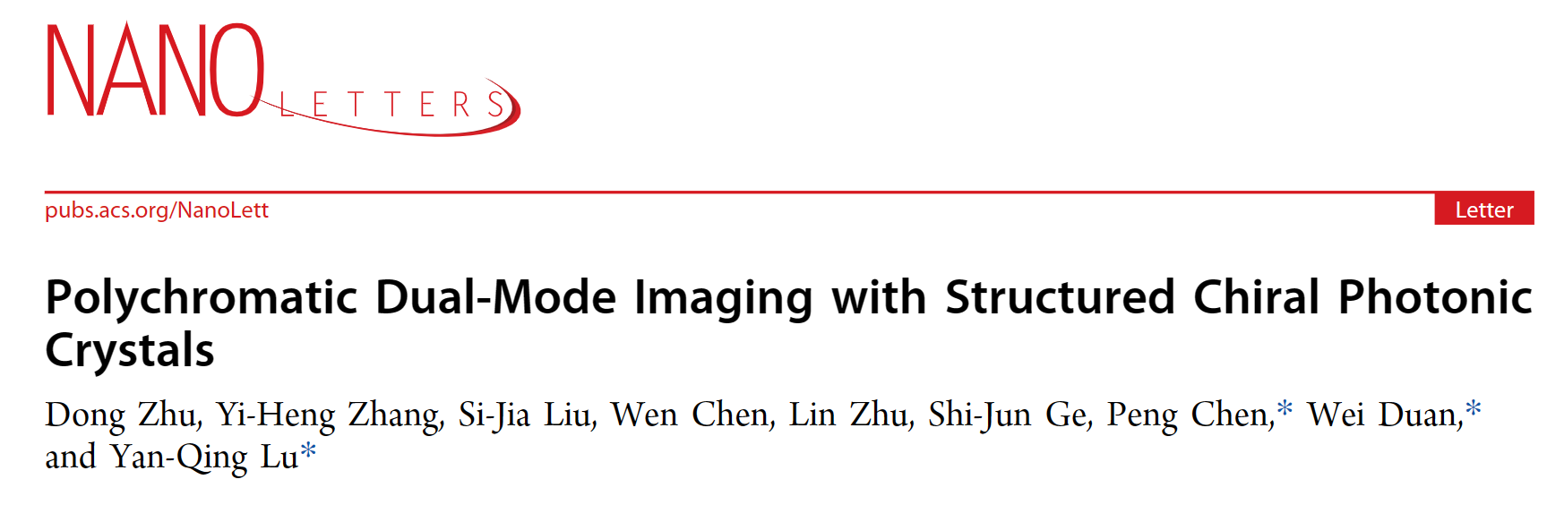 相关成果以“Polychromatic Dual-Mode Imaging with Structured Chiral Photonic Crystals”为题,在线发表于Nano Letters上(DOI: 10.1021/acs.nanolett.3c03437)。太阳成集团122ccvip为该工作的第一单位,太阳成集团122ccvip博士生朱栋为第一作者,太阳成集团122ccvip陈鹏副教授、陆延青教授与北京航空航天大学段薇博士为共同通讯作者,研究生张逸恒、刘思嘉、陈闻、朱琳及葛士军副研对本文亦有重要贡献。该研究由国家重点研发计划(青年科学家项目)、江苏省前沿引领技术基础研究专项、国家自然科学基金优秀青年科学基金等资助完成。
