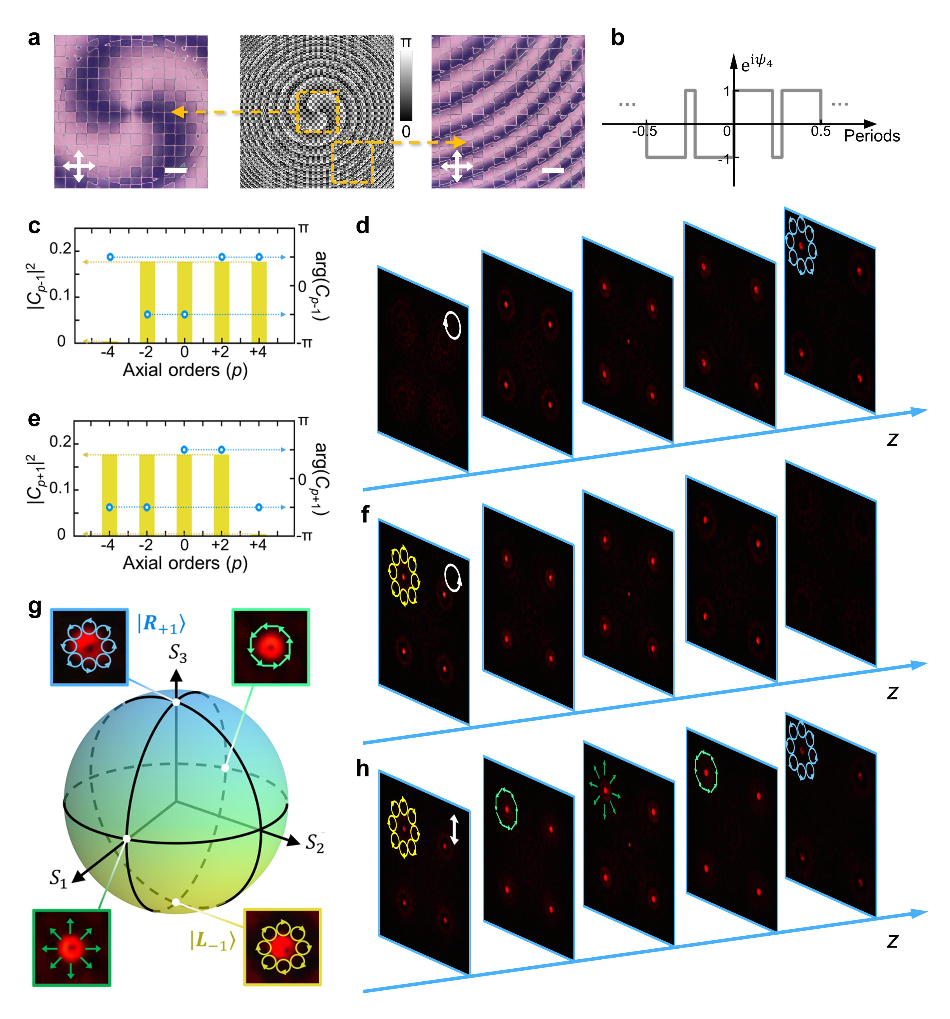 集成PB透镜结构,该液晶几何相位元件在圆偏振光入射时产生三维涡旋光阵列,在线偏振光入射时产生三维矢量光阵列;入射任意偏振态,理论上可构造任意庞加莱球光束的三维全同阵列。其二,集成特定焦距的PB透镜结构,根据“偏移-重合”设计原理,该元件在正交圆偏振光入射时产生轴向偏移的涡旋光阵列,在线偏振光入射时产生相反拓扑荷涡旋光、正交偏振矢量光的混合三维阵列,即实现了高阶庞加莱球上四种典型OAM光束的轴向交替(图3)。此外,课题组还测试了器件在不同波长下的工作效果,实验结果表明,所提出的液晶几何相位元件具有电控多波长适用的特点。