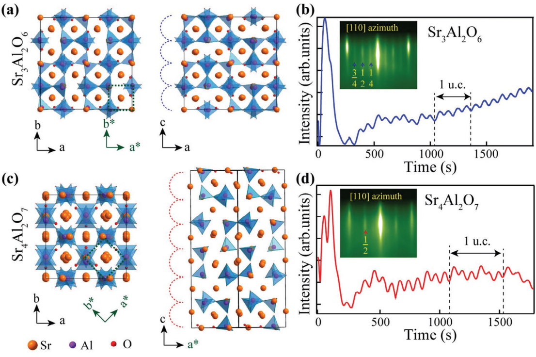 在已报道的不同类型的牺牲层中, Sr3Al2O6化合物因其可通过水溶解以转移自支撑薄膜,对环境友好且可制备出原子级平整的高质量自支薄膜,最受人们关注。然而,这类材料的水溶速率较低,即使制备毫米级小尺寸的自支撑薄膜也需要花费较长时间(可高达数小时),难以实现晶圆级大尺寸自支撑薄膜的制备与集成,无法满足实际器件应用的要求。本工作提出创新思路,考虑到Sr3Al2O6化合物中离散Al-O网络是其具有优异水溶性的一个重要原因,设计新结构进一步提升Al-O网络的离散度并提高易水溶的Sr-O成分在材料中的比例,并利用氧化物MBE技术系统探索了Sr4Al2O7薄膜的制备与物性。实验发现利用Sr4Al2O7牺牲层也可实现原子精度自支撑薄膜的制备,且其水溶速率得到了大幅提升,约为Sr3Al2O6的10倍。此外,研究还表明牺牲层的溶解速率还依赖于其厚度,提高膜厚可进一步提升溶解速率。类比于Sr3Al2O6体系,Sr4Al2O7也可以通过将Sr部分替换为原子半径更大的Ba或更小的Ca来调节其晶格常数以获得高的晶格适配度,进而制备出更高质量的自支撑钙钛矿氧化物薄膜。