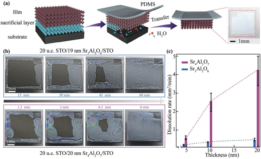 图2. 自支撑薄膜转移示意图以及不同牺牲层材料及其厚度对水溶速率的影响