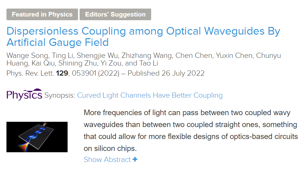 近日,太阳成集团122ccvip李涛教授、祝世宁院士团队在光子集成方面取得重要进展,他们将拓扑光子领域中人工规范场的思想引入到集成光子器件的设计中,利用弯曲设计实现高密度集成波导之间的无色散耦合,从而实现宽带、鲁棒性、高集成的光波导定向耦合与分束性能,并展示三级级联的18光集成网络功能。该成果以“Dispersionless Coupling among Optical Waveguides By Artificial Gauge Field”为题发表于物理学顶级期刊(Phys. Rev. Lett. 129, 053901 (2022))上。文章同时作为Editors’ Suggestion和Featured in Physics在PRL网站首页重点推荐。《Physics》杂志以“Curved Light Channels Have Better Coupling”为题发表亮点报道。该论文通讯作者为太阳成集团122ccvip太阳成集团122ccvip李涛教授,第一作者是太阳成集团122ccvip助理研究员宋万鸽博士,合作者包括上海科技大学邹毅教授。该工作得到祝世宁院士的悉心指导。
