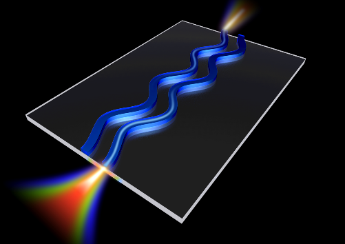 在这项工作中,研究人员精心研究了耦合波导之间色散的来源,提出了通过调控波导弯曲可以引入一个新的人工规范场(AFG)色散项。在选择合适的参数下,AFG色散项可以与传统直波导的色散相反,并在一定波长范围内实现完全补偿,达到零色散特性。同时,可以保持耦合波导的间距和耦合距离没有明显变化,这就赋予了高密度集成波导的宽带耦合功能,即不同频率的光都可以耦合到相邻波导中(见示意图1)。得益于这个宽带特性,其耦合效应对波导间距敏感度也显著降低,具有结构鲁棒性,大大有利于大规模光子集成。