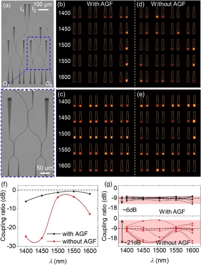 图3弯曲硅波导实现宽带鲁棒的定向耦合及分束功能(实验结果)