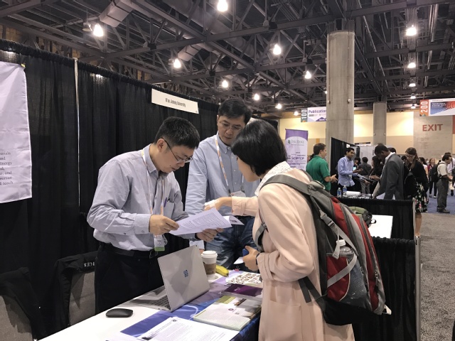 会议期间招聘展台吸引了国内外材料学领域人才的驻足与关注,与会的张会刚教授积极参与招聘工作,向前来咨询的博士、博士后积极解答各种问题。此次海外招聘吸引了来自UCLA、斯坦福大学等多所著名高校的多位优秀博士与博士后提交简历,部分亦报名参加5月份“太阳成集团122ccvip青年学者论坛——太阳成集团122ccvip分论坛”,代表团在宣讲会之后对精心挑选出来的几名申请人进行了深入交流与沟通。