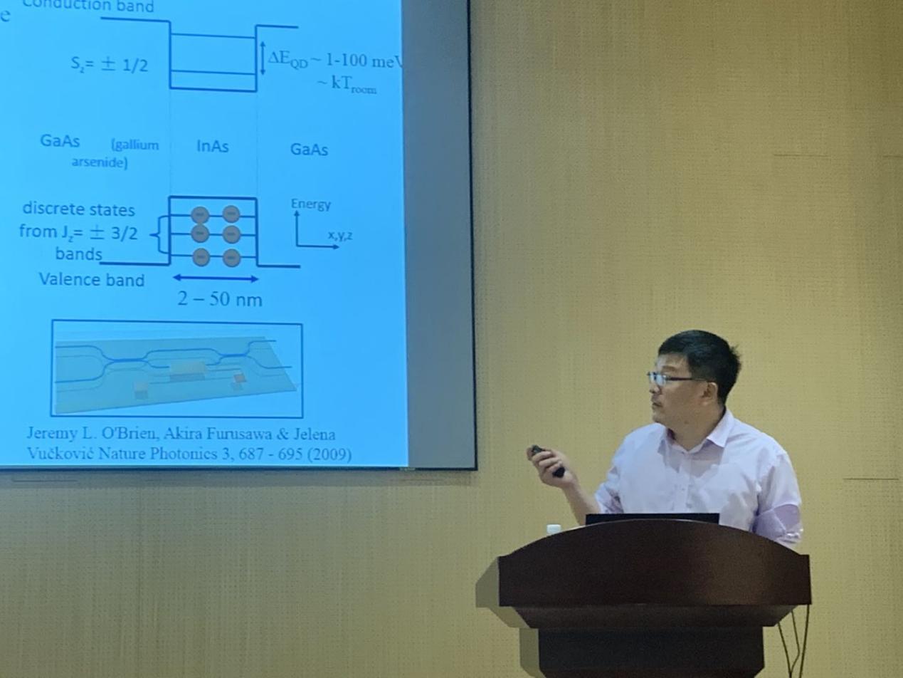 许秀来研究员在低维半导体体系的光电物理与器件领域拥有研究卓远的见识和丰富的研究经验,并致力于探索其在量子信息处理与自旋电子学中的应用。本次报告中,许秀来研究员首先介绍了半导体单量子点中电荷、激子、自旋以及波函数的外场调控。由于量子点激发具有稳定性、高重复频率、电致发光等特点,且可与多种系统耦合,单量子体系的多场调控在在计算、操控与存储等信息技术方面有着深远的应用前景。以量子点在磁场中的调控为例,许秀来研究员所在课题组测量了量子点g因子的各向异性,并探讨了这种对称性的打破对明暗激子产生过程的影响。