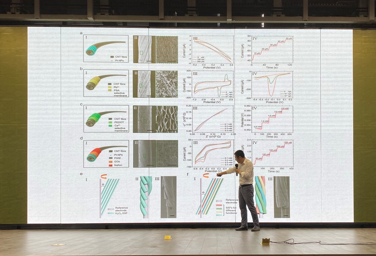 随后,彭慧胜教授还介绍了柔性纤维传感器,它能够对一系列生理指标进行监测,在体内外均可实现应用,具有可注射性、高安全性和优异的力学相容性。智能纤维材料还可制备形成纤维集成系统,如纤维忆阻器等。