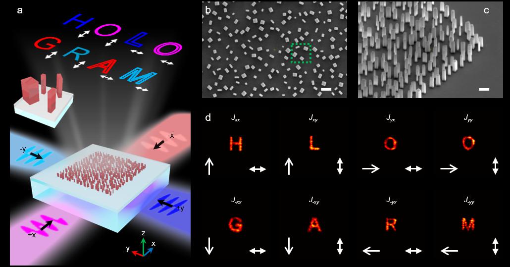 实验上,研究团队借助遗传算法将四幅纳米打印图像和四幅全息图像对应的复振幅分布加载到琼斯矩阵的四个元素上,并成功制备了相应的片上超构表面(图3a-b)。在沿+x和+y方向的导波照明下,经水平和垂直线偏振片分析,导模辐射在近场呈现四个希腊字母图像,同时在远场投影出四个英文全息字母(图3c),充分展示了琼斯矩阵全参数调制功能。