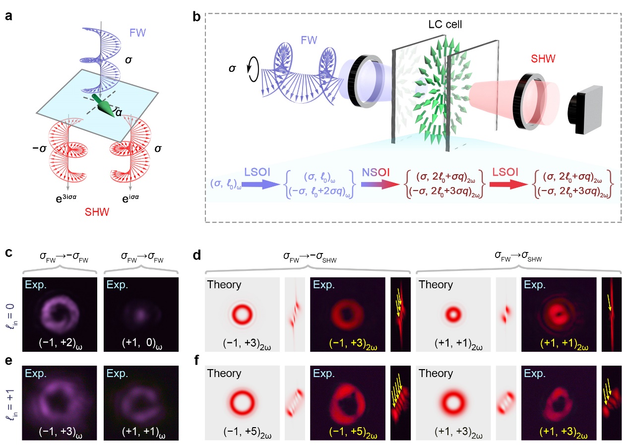 随后,研究人员进一步探究了该液晶体系中特有的级联式线性/非线性光学自旋-轨道角动量相互作用现象,揭示了铁电向列相液晶在圆偏振飞秒激光泵浦下的非线性几何相位编码原理。如图3a所示,在圆偏振飞秒激光泵浦下,当铁电向列相液晶极化矢量绕着z轴逆时针方向旋转α时,所激发的左右旋圆偏振倍频光将携带不同的非线性光学几何相位,其中,具有与基频光同自旋态(σ)和反自旋态(−σ)的倍频圆偏振光将分别携带σα和3σα的非线性光学几何相位,展现出自旋锁定的特点。