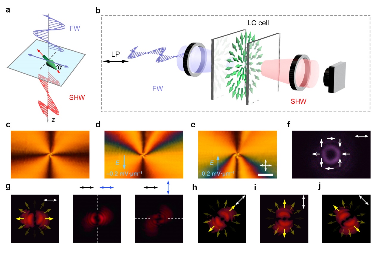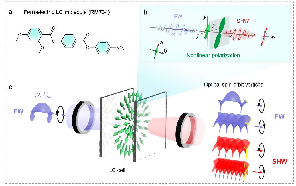 液晶材料在光场调控领域已表现出优越的性能。在线性光学领域,液晶在涡旋光产生、全息成像等方面取得了应用广泛;在非线性光学领域,也在自相位调制、自聚焦和自衍射等非线性光学过程中展现出自组装、动态可调等诸多优势。然而,由于普通向列相液晶材料固有的中心反演对称性,它们通常不具备二阶非线性光学响应,因此在频率转换领域难以取得重要应用。近年来,随着铁电向列相液晶的出现,这种局面发生了改变。铁电向列相液晶于1916年被著名物理学家M. Born预测存在,约一个世纪后终于得到了实验验证,该材料展现出宏观的自发极化、高介电常数、强二阶非线性极化率等效应。借助这一新型材料体系,人们实现了倍频、纠缠光子对的产生。然而,铁电向列相液晶在非线性光学领域中用于可重构与结构化光场调控等方面的性质尚未被探究。