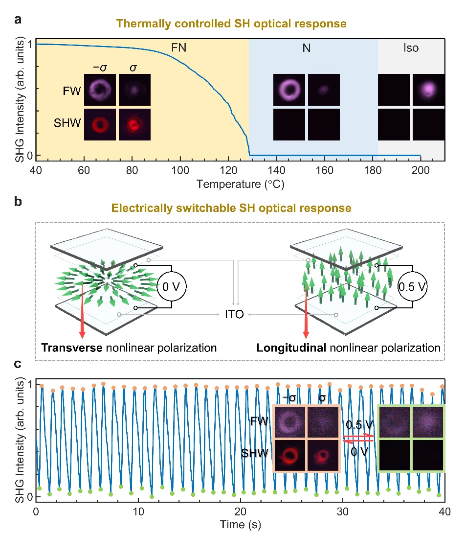 图4.热场和电场驱动下的动态非线性光场调控。FN:铁电向列相。N:向列相。Iso:各向同性相。