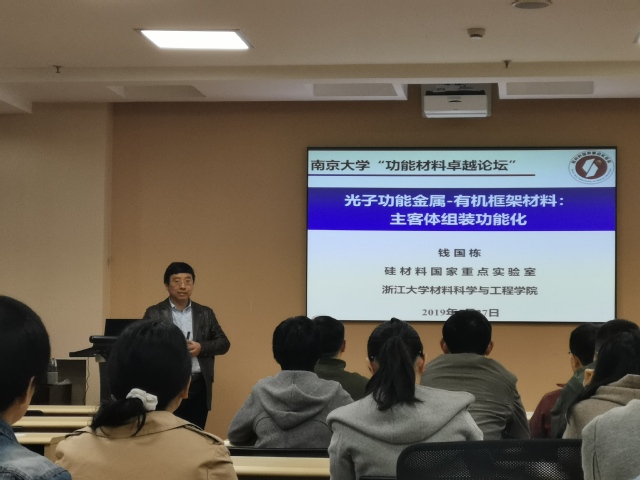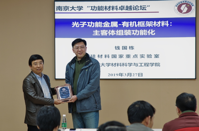 2019年3月27日下午两点,“功能材料卓越论坛”第一期第一讲在唐仲英楼B501开讲。论坛首次邀请到的嘉宾是浙江大学硅材料国家重点实验室副主任,浙江大学无机非金属材料研究所所长,国务院学位委员会第七届学科评议组成员钱国栋教授。报告题为“光子功能金属-有机框架材料:主客体组装功能化”。报告由江苏省功能材料设计原理与应用技术重点实验室主任吴迪主持,吴迪教授代表实验室向钱国栋教授赠送讲坛纪念品。