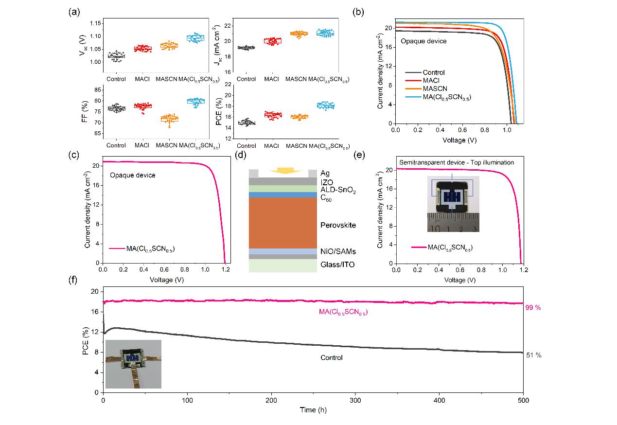 Figure 3. Photovoltaic performance of PSCs with varied additives. a) Photovoltaic parameters (Voc, Jsc, FF, and PCE) derived from 30 opaque devices. b) J–V curves of the champion opaque devices (0.049 cm2 aperture area). c) J–V curve of the champion opaque device with MA(Cl0.5SCN0.5) and surface passivation. d) Schematic view of the semitransparent cells illuminated from IZO side. e) J–V curve of the champion semitransparent cells with MA(Cl0.5SCN0.5) (aperture area of 1.05 cm2). f) Maximum power point (MPP) tracking of an encapsulated semitransparent cell.