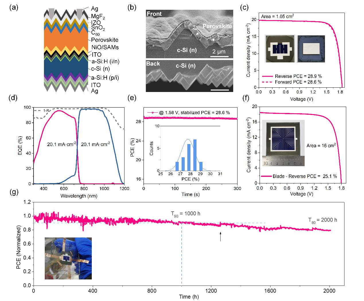 Consequently, they fabricated efficient perovskite/ silicon tandem solar cells employing the industrially feasible double-side textured silicon with pyramids over 3 µm, reaching an impressive efficiency of 28.9% (active area of 1.05 cm2) with a certified value of 27.9%. The corresponding Jsc value was up to 19.8 mA cm−2. The encapsulated tandem exhibited superior operation stability, maintaining over 80% of its initial output after over 2000 h MPP tracking. They also demonstrated that this strategy is compatible with the up-scaling process by employing the blade coating method, the tandems with a large aperture area of 16 cm2 achieved an efficiency of 25.1%, which is one of the highest reported values for perovskite/silicon tandem with an area over 10 cm2. The efficient strategy proposed herein could be widely applied in the commercialization of PSCs.