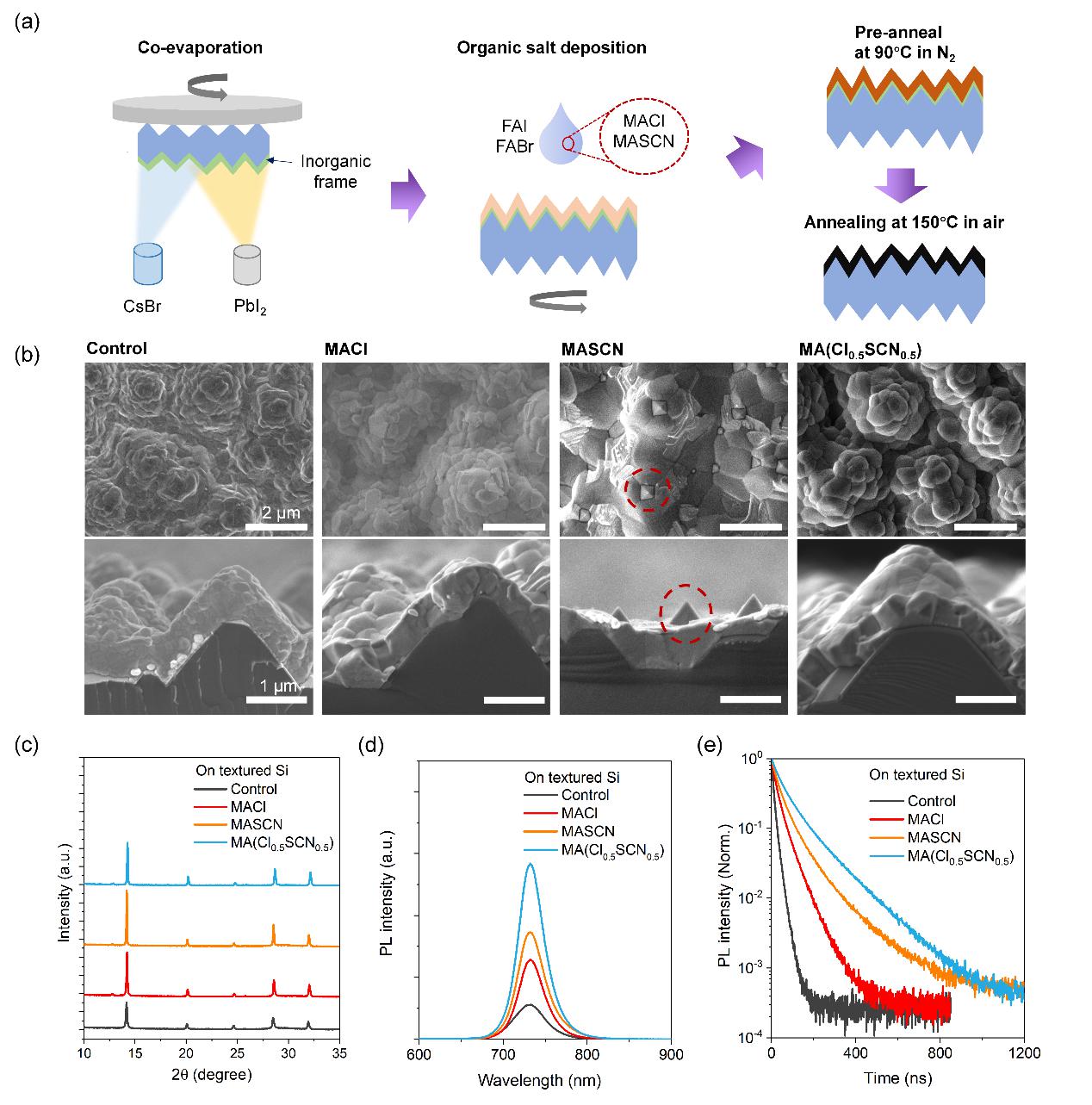 To solve the above problem, Tan's team and collaborators developed an organic anion additive assisted crystallization strategy, which introduced two organic salts, MACl (methylamine chloride) and MASCN (methylamine thiocyanate), into the solution spin-coating step of the hybrid two-step process. The reaction between the inorganic framework of PbI2 (lead iodide) prepared by evaporation and the organic components in the precursor solution was effectively regulated. And the conformal deposition of perovskite films with larger grains, lower trap density, and suppressed light-induced phase segregation was realized on the industrial texture silicon. By comparison, it is found (figure 1b, c, d) that without any additives, the reaction of perovskite is insufficient and the crystallinity is poor. MACl can merely promote the reaction and crystallization. MASCN can significantly improve the growth rate and size of grains by inducing crystal reconfiguration, but too large grains cannot achieve good conformal growth along the crystalline silicon surface. The combination of the two additives can give full play to their advantages and achieve the deposition of high quality perovskite thin films.