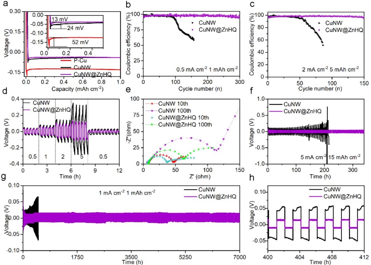 Figure 3 Electrochemical properties and cycling stability of P-Cu, CuNW@ZnHQ and CuNW. a) Voltage curves of Li plating at a capacity of 1 mAh cm−2 and a current density of 0.5 mA cm−2. CEs of Li plating/stripping b) at 0.5 mA cm−2 (1 mAh cm−2) and c) at 2 mA cm−2 (5 mAh cm−2) with a cut-off voltage of 1.0 V vs. Li+/Li during stripping. d) Rate capability and voltage curves under various current densities from 0.5 to 5 mA cm−2. e) EIS spectra of CuNW and CuNW@ZnHQ in the 10th and 100th cycle. Time-voltage profiles under density of at f) 5 mA cm−2 (15 mAh cm−2) and g, h) 1 mA cm−2 (1 mAh cm−2).