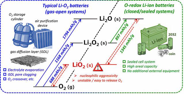 The open system lithium-oxygen battery needs to carry the cumbersome weight of accessories such as cylinders, air filters, etc. At the same time, the diffusion of gas is easily affected by the electrode structure and solid discharge products. Whilethe sealed lithium-oxygen system can achieve a very high energy density (compared to existing cathode materials of lithium battery). In the meanwhile, lithium superoxide is considered to be in a very nucleophilic aggressive form. Therefore, when designing the research, we plan to avoid the formation of superoxide as much as possible, abandon the three-electron ( two oxygen atoms) capacity that Li2O/ LiO2 may provide, and instead conservatively ensure the reversible Li2O/ Li2O2-basedtwo-electron ( two oxygen atoms) reaction to the largest extent. Between capacity expansion and reversibility, effectively guaranteeing reversible capacity is the key to success. The thermodynamic theoretical potential is as follows: