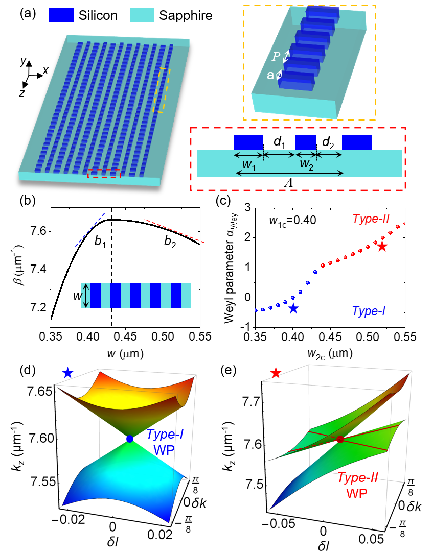 In this study, researchers used subwavelength grating (SWG) waveguides to construct Type-II Weyl points in the optical frequency range, revealing the topological phase transitions and interface effects within Type-II Weyl heterostructures. With the rich parameter space provided by SWG waveguides, researchers successfully constructed artificial Weyl heterostructures (Fig. 1a). More interestingly, by adjusting waveguide parameters such as duty cycle and width, they achieved abnormal waveguide "dispersion" (the mode constant decreases as the waveguide width increases, see Fig. 1b), which is key to realizing Type-II Weyl points (traditional waveguides only support Type-I Weyl points). Based on this, researchers demonstrated the phase transition process from Type-I to Type-II Weyl points by adjusting the parameters of SWG waveguides (Fig. 1c-e), and constructed Weyl heterostructures by connecting two independent Type-II Weyl media.