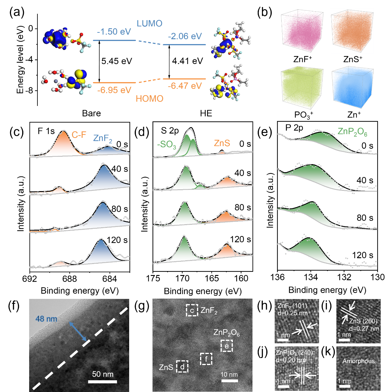 Figure 3. (a) LUMO and HOMO energy levels of solvation structures in bare and HE electrolytes. (b) TOF-SIMS 3D spectra of ZnF+, ZnS+, PO3+, and Zn+ in HE electrolyte. In-depth XPS spectra of (c) F 1s, (d) S 2p, and (e) P 2p on the Zn anode surface after 30 cycles in HE electrolyte. (f) TEM and (g-k) HRTEM images of Zn anode after 30 cycles in HE electrolyte.