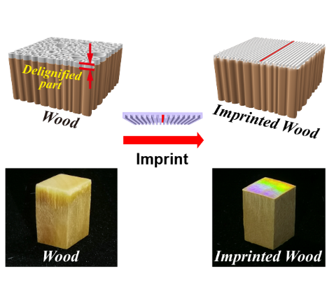 Improving the functionality and performance of natural materials and promote their modern applications will give considerable impetus to the sustainable development of society. Wood is endowed with great biodegradability and has abundant sources. Nevertheless, plants is restricted by their sizes, defects, essential needs for life and many other things for a long time. As a result, their performance fail to meet modern requirements, which limits their applications only to traditional areas such as architecture and furniture for a long time. Surface micro- and nano-structures are the foundation of many optical and photonic devices. Realizing fabrication of nanostructures on wood surfaces will enable its applications in optical or photonic materials and devices as well as completely biodegradable, disposable environmental friendly materials and devices. However, wood is a highly porous structure formed mostly by aligned longitudinal cells. With such rough surface at micron scale, nanostructures are hard to form. To make it worse, cellulose which is the main gradient of wood shows no thermal plastic deformation property. Therefore, it remains a challenge to realize precise nanostructures on wood surface.