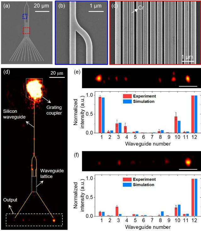 propagation of the system; Experimentally detected output intensities of (e) near-zero and (f) exact-zero modes.