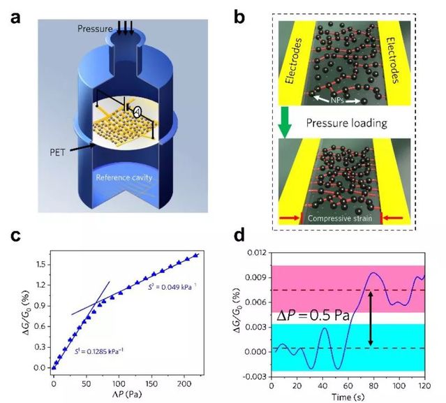 The research group used a mask coating method to print interdigital electrodes (IDEs) on a 0.05mm thick polyethylene terephthalate (PET) material. Using the nanocluster deposition system, the controllable preparation of metal NP arrays between the IDEs was achieved. Finally, the PET membranewasencapsulated on a reference cavity to complete the preparation of the pressure sensor. When the pressure sensor is placed under different ambient pressure, the external pressure and the internal pressure of the reference cavity form a new mechanical balance on the PET membrane. The strain of the PET membrane will change the tunneling conductance of the NP arrays and be measured by a electrical circuit. The sensitivity of the pressure sensor reaches 0.13 kPa-1, and the pressure change as small as 0.5 Pa can be detected in an atmospheric pressure environment (Fig. 1) (compared with the current general silicon-based sensor, the resolution is improved by more than 3 orders of magnitude, and it is far beyond the pressure sensors made of other materials).