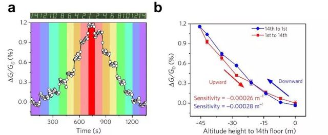 Figure 2 (a) Realtime conductance changes in response to the variation in the floor elevation;(b) Summary of the data in (a) ,the elevation of each floor is converted into a height difference with respect to the 14th floor (calculated by the height of 3.5 meters per floor)