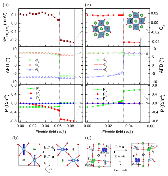 Figure 2 (a),(b) Physical quantities as a function of the electric field applied along −b, i.e., perpendicular to the initial direction of the polarization, and (c),(d) applied along a, i.e., antiparallel to the initial direction of the polarization, in the studied PTO/LTO superlattice. (a) Energy difference between ferromagnetic configurations along a and b; oxygen octahedral tilting angles, Φx, Φy, and Θz; and polarization P. (b) Schematization of the spin configurations on Ti3+ ions, which can be switched by 90° via the application of electric fields oriented along the −b axis or the −a axis. (c) JT distortion Q, and oxygen octahedral tilting angles and polarization. (d) Charge density of states near the Fermi level in energy range from −0.5 to 0 eV. The black open symbols in (a) and (c) represent the same quantities when the electric field is released.