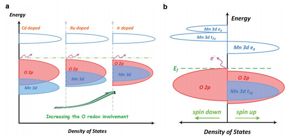Figure 1 (a) Schematic diagram of the state density structure of the Mn-based layered sodium-rich material after Cd Ru Ir doping; b) Schematic diagram of the energy band structure of Ir-doped Na1.2Mn0.4Ir0.4O2