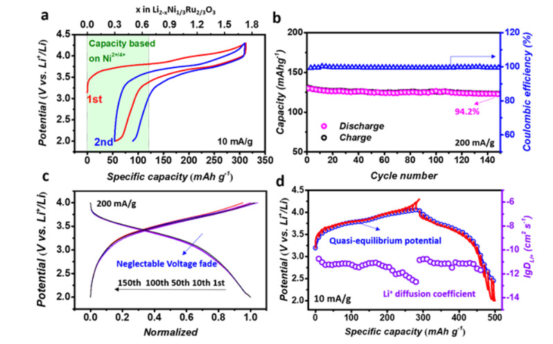 The layered lithium-rich material has more active lithium ions that can participate in the deintercalation behavior during charge and discharge, and provides a specific capacity greater than 250 mAh g-1 compared to positive electrode materials (such as lithium cobalt oxide, lithium iron phosphate, etc.). Besides the transition metal valence mechanism, the mechanism of oxygen activation has also been discovered during the charging and discharging process. The activation of oxygen provides the possibility of large-capacity behavior of the material. However, oxygen activation induces irreversible oxygen deficiency that changes the layered structure to spinel phase, leading to a capacity and voltage decay of layered lithium-rich materials during cycling. The research group of Haoshen Zhou and Shaohua Guo developed a new type of Fd-3m cubic lithium-rich rock-salt oxide Li2Ni1/3Ru2/3O3, which has a stable structure, large capacity, outstanding rate capability as well as good cycling performance with negligible voltage decay. The research group characterized the structural stability of the material by in-situ X-ray diffraction, confirmed the oxygen activation behavior by in-situ Raman and in-situ gas mass spectrometry, and supported material stability at a high rate by first-principles calculations.