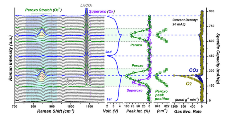 The capacity retention rate is above 94%after 150 cycles at a current density of 200 mA g-1. As shown in Figure 1c, the curves of the first circle and the 150th circle basically overlap, and the voltage decay is unnoticeable, revealing the outstanding stability of the rock-salt material. The theoretical calculation also indicates a high diffusion coefficient of lithium ions at high rate, owning to the new Fd-3m rock-salt structure. Raman spectroscopy can be used as a fingerprint spectrum to determine covalent bonds between substances. In the Raman spectrum at the early stage of charging, no peroxygen bond is generated. At the later stage of charging, the peroxygen bond appears and subsequently blue shifts, indicating that the bond length is getting shorter and reaches the shortest at the end of the charge. During the discharge process, the peroxygen bond exhibits symmetry behaviors to the charging process, as same as in the second cycle, indicating the reversibility of the peroxygen bond, and the ability of oxygen brings extra-large capacity through reversible price changing. Superoxide appears for a second at the end of the first circle but disappears in the second circle, suggesting the stability peroxygen bonds and indicating there is no relation between the formation of superoxide and peroxygen bonds. This material is promising in the future design of large-capacity cathode materials because of its advantages in the stability of the capacity and discharge potential.