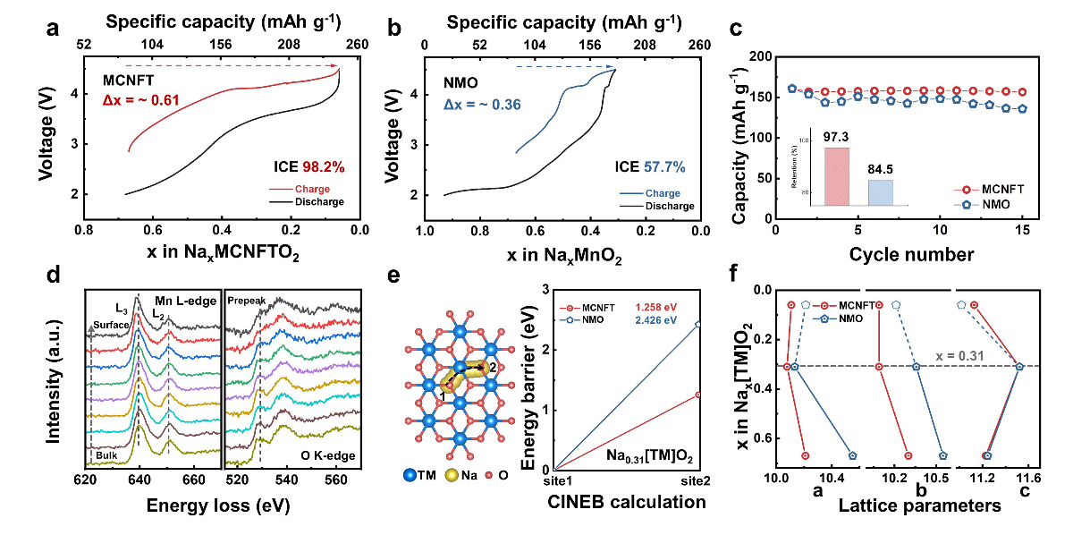 Figure a), b) Charge and discharge curves and c) Cycling performances of MCNFT and NMO within a voltage range of 2.0 - 4.5 V at 10 mA g-1. Inset shows the capacity retention over 15 cycles. d) Line-scan EELS spectra recorded from the surface to the bulk. e) Energy barriers and pathways for Na+ migration in Na0.31[TM]O2. f) The lattice parameters with varying Na contents (x) in MCNFT and NMO from x = 0.67 to 0.06