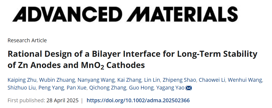 The related research work, titled “Rational Design of a Bilayer Interface for Long-Term Stability of Zn Anodes and MnO₂ Cathodes,” was published in Advanced Materials, a top-tier journal in the field of materials science. Kaiping Zhu, a Ph.D. candidate, and Wubin Zhuang, a master's student from the College of Engineering and Applied Sciences at Nanjing University, are the co-first authors of the paper. This work was supported by the National Key R&D Program of China (2024YFE0109200), the Fundamental Research Funds for the Central Universities (No. 2024300440), and Guangdong Basic and Applied Basic Research Foundation (2025A1515011098). The work also received strong support and assistance from the National Laboratory of Solid State Microstructures, the College of Engineering and Applied Sciences, the Jiangsu Key Laboratory of Artificial Functional Materials, the Collaborative Innovation Center of Advanced Microstructures at Nanjing University, and the Shenzhen Research Institute of Nanjing University.