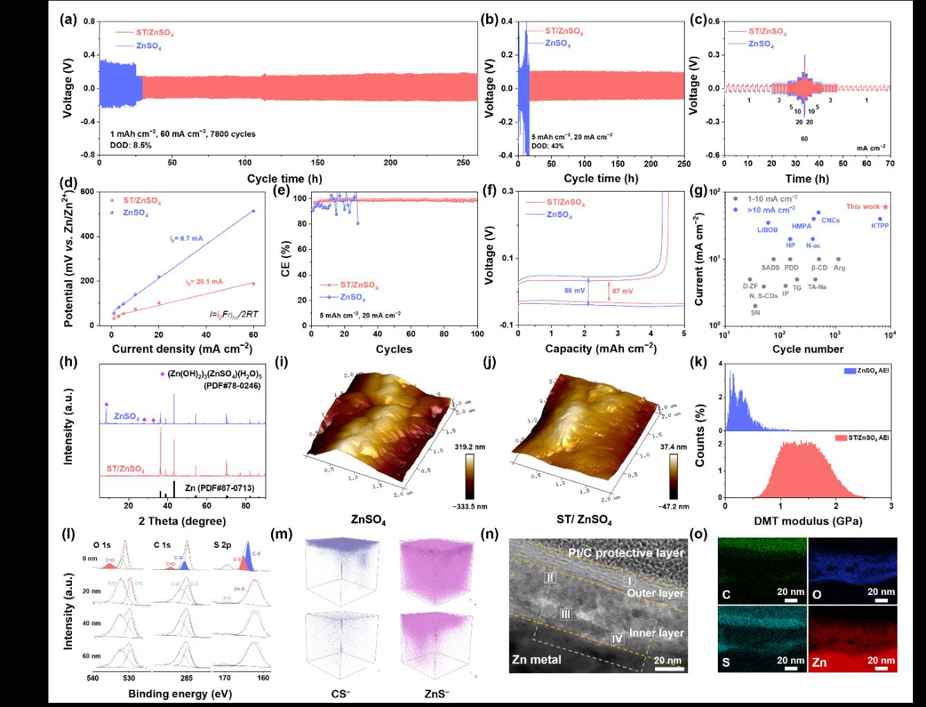 Figure 5 presents the performance and formation mechanism of ST molecules at the interface between the zinc anode and the electrolyte. The formation of this bilayer structure significantly enhances the mechanical strength and chemical stability of the Zn anode–electrolyte interface, effectively preventing direct contact between H₂O in the electrolyte and the zinc electrode, thereby suppressing side reactions. Owing to this unique design, the ST-enhanced zinc symmetric cell achieves an ultra-long cycle life of up to 7,800 cycles under a high current density of 60 mA cm⁻².