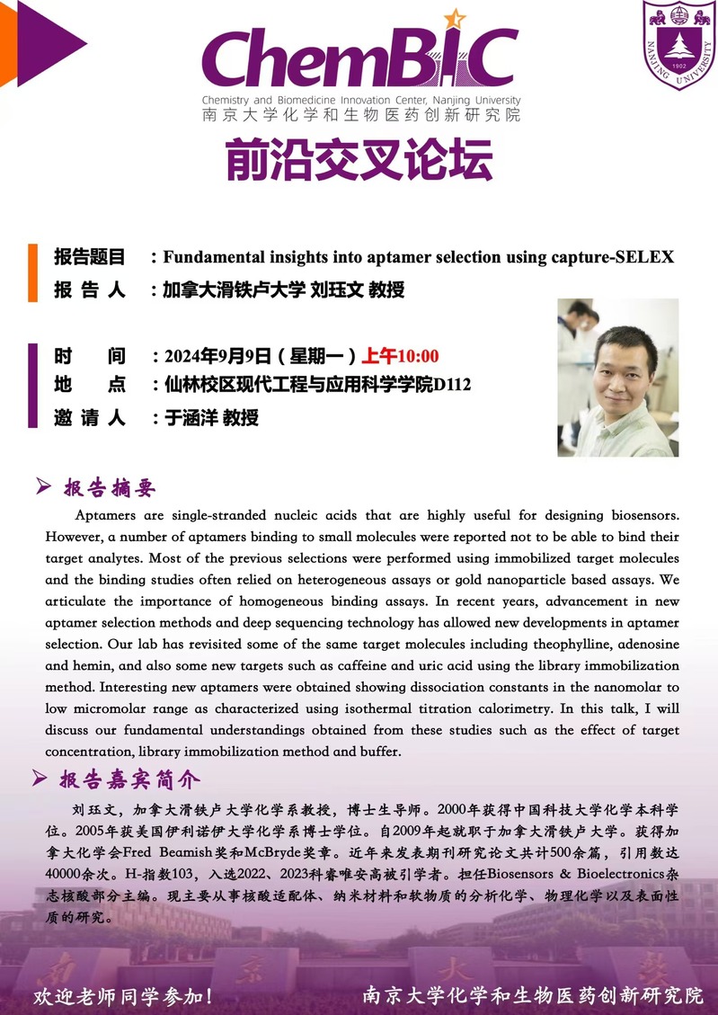 Prof. Yuwen Liu,University of Waterloo: Fundamental insights into aptamer selection using capture-SELE》
