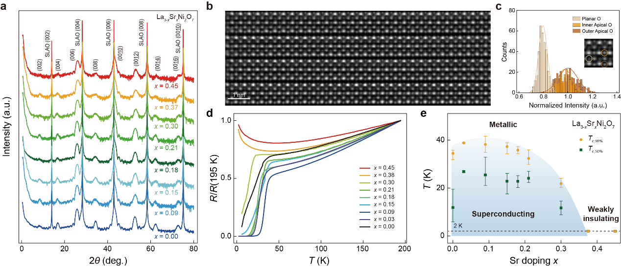 Figure 1. Structural characterization, superconducting properties, and phase diagram of Sr-doped La₃Ni₂O₇ thin films.